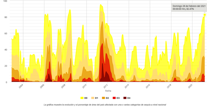 El Servicio Meteorológico Nacional reportó que 82 por ciento del territorio nacional tiene algún tipo de sequía o se encuentra anormalmente seco.
