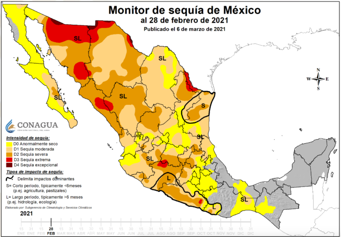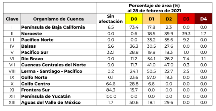 En el último reporte la dependencia destaca que durante la segunda quincena de febrero se registraron lluvias por debajo del promedio en el noreste, occidente, centro y centro sur del país, por lo que se incrementó el número de áreas con sequía de moderada a severa en los estados de Sinaloa, Nayarit, Durango, Zacatecas, San Luis Potosí, Tamaulipas, Jalisco, Colima, Michoacán, Guanajuato, Querétaro, Hidalgo, Guerrero y Estado de México.