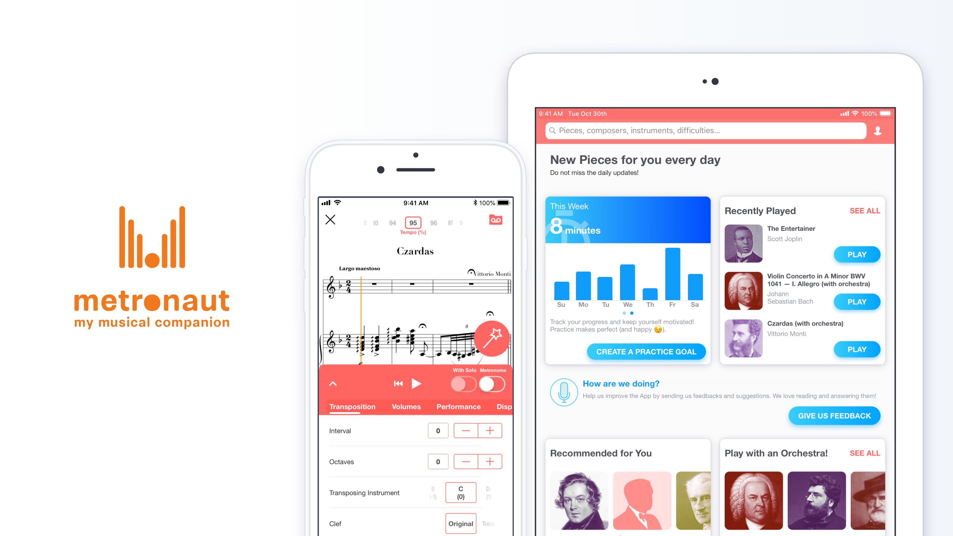 Metronaut te permite tocar un instrumento musical con una orquesta profesional tocando todos los demás instrumentos contigo. No es solo un reproductor de audio: la aplicación aprovecha el micrófono del dispositivo para escuchar su música y ajustar el tempo de los otros instrumentos.
