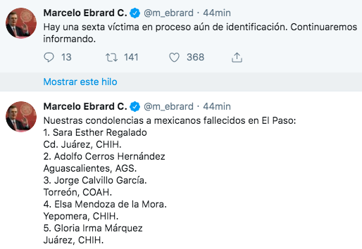 El secretario de Relaciones Exteriores, Marcelo Ebrard, dio a conocer que la dependencia a su cargo proporcionará a la Fiscalía General de la República todos los elementos con que cuenta sobre el ataque armado ocurrido en El Paso, Texas, a fin de que inicie una denuncia por terrorismo contra mexicanos en Estados Unidos.