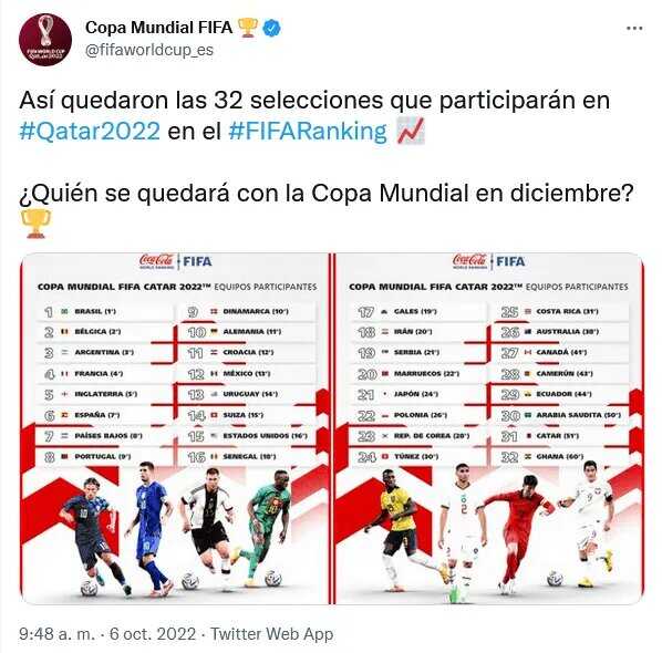 La Selección de Brasil, que dirige Tite, aumentó su ventaja sobre Bélgica al frente de la última clasificación mundial de la FIFA previa al Mundial de Qatar 2022, en la que España ha perdido la sexta plaza en favor de Italia. La Selección Mexicana también cayó en el ranking previo a la Copa del Mundo.