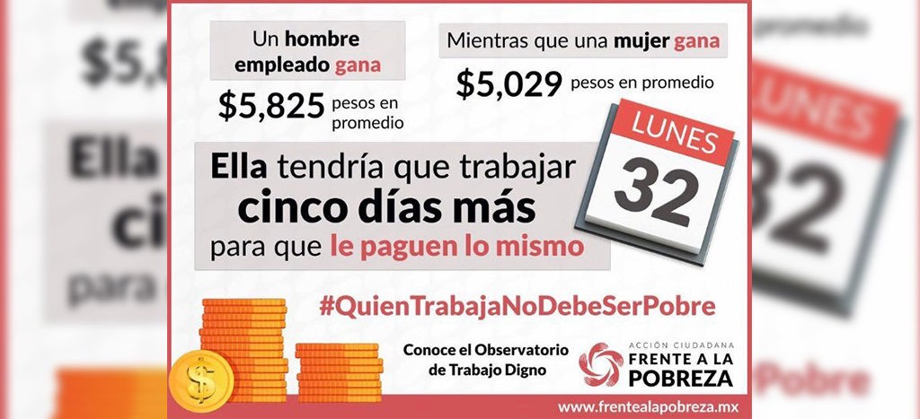 En México, una mujer tendría que trabajar 5 días más para que le paguen lo mismo que a un hombre.https://t.co/P5opUyaVKJ#QuienTrabajaNoDebeSerPobre #EquidadDeGénero pic.twitter.com/F6HIm2A7Kc— Acción Ciudadana Frente a la Pobreza (@FrenteaPobreza) July 22, 2019
