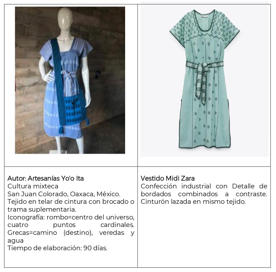 En el caso de Zara, el llamado es ante la pieza identificada como “Vestido midi de escote pico y manga corta. Detalle de bordados combinados a contraste. Cinturón lazada en mismo tejido. Bajo con aberturas laterales”, la cual toma elementos de la cultura mixteca, del municipio de San Juan Colorado, Oaxaca, donde el huipil tradicional forma parte de la identidad de las mujeres, quienes elaboran cada lienzo desde las materias primas; es tejido en telar de cintura y refleja símbolos ancestrales relacionados con el medio ambiente, historia y cosmovisión de la comunidad. Cada huipil tarda en su elaboración por lo menos un mes de trabajo.