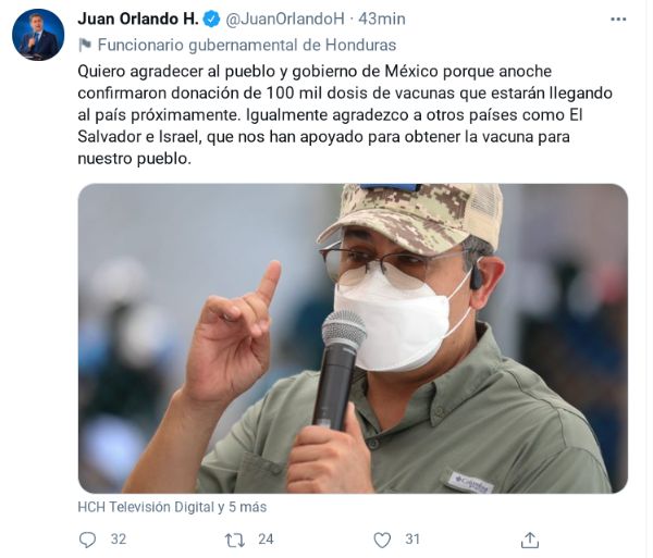 “Igualmente agradezco a otros países como El Salvador e Israel, que nos han apoyado para obtener la vacuna para nuestro pueblo”, manifestó Hernández en sus redes sociales.