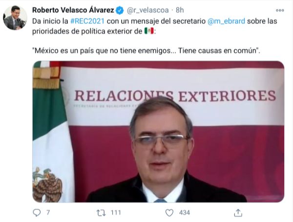El evento se llevó a cabo de forma privada vía teleconferencia, como medida sanitaria para evitar contagios de coronavirus, pero el director para América del Norte de la Cancillería, Roberto Velasco, difundió, a través de su cuenta de Twitter, la frase del secretario Ebrard.