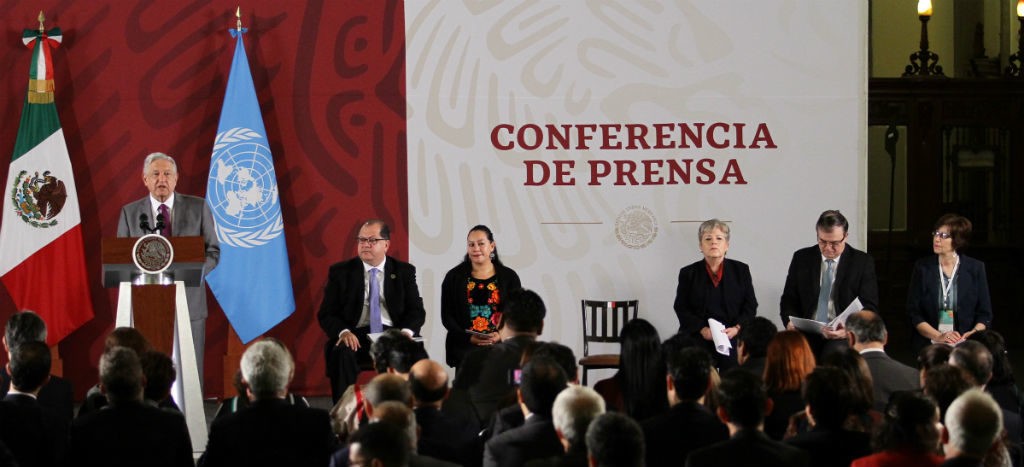 En Palacio Nacional se dieron cita Marcelo Ebard, secretario de Relaciones Exteriores; María Luisa Albores, secretaria de Bienestar; Alicia Bárcena, secretaria ejecutiva de la Comisión Económica para América Latina y el Caribe (CEPAL), Marina Arismendi, ministra de Desarrollo Social de Uruguay; además del presidente AMLO.