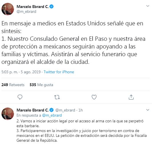 El canciller mexicano, Marcelo Ebrard, señaló que este martes se reunirá con el fiscal general de la república, Alejandro Gertz Manero, para entregarle la información recabada sobre el tiroteo en El Paso, Texas, en el que murieron ocho mexicanas y mexicanos, y así interponer una denuncia por terrorismo.