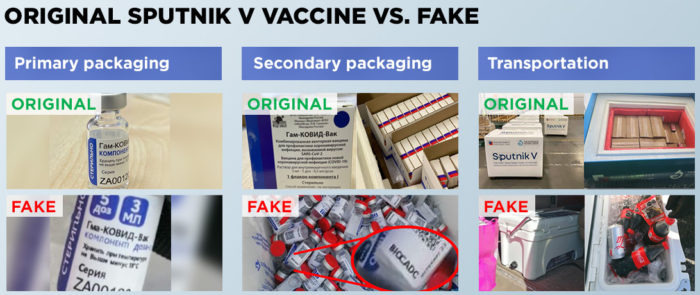 En una infografía publicada por el Fondo Ruso se indica que la vacuna real tiene una letra en cirílico mal escrita, no utiliza el tamaño de letra y el diseño oficial.