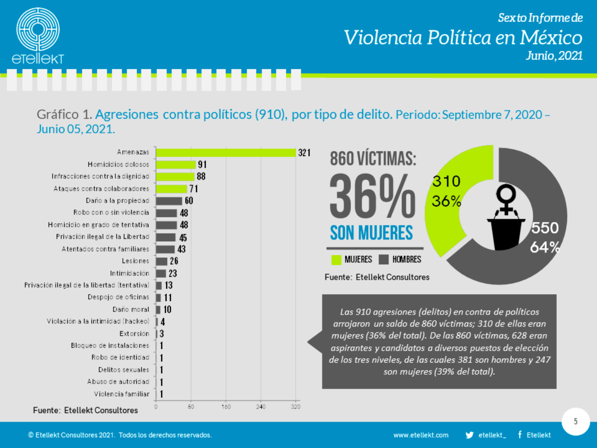 En su Sexto Informe de Violencia Política publicado el 5 de junio, Etellekt reportó que del 7 de septiembre de 2020 a al día previo de la jornada electoral más grande de la historia de México, se registraron 910 agresiones en contra de político, las cuales dejaron 860 víctimas de las que 310 (36%) son mujeres y 550 (64%) son hombres.