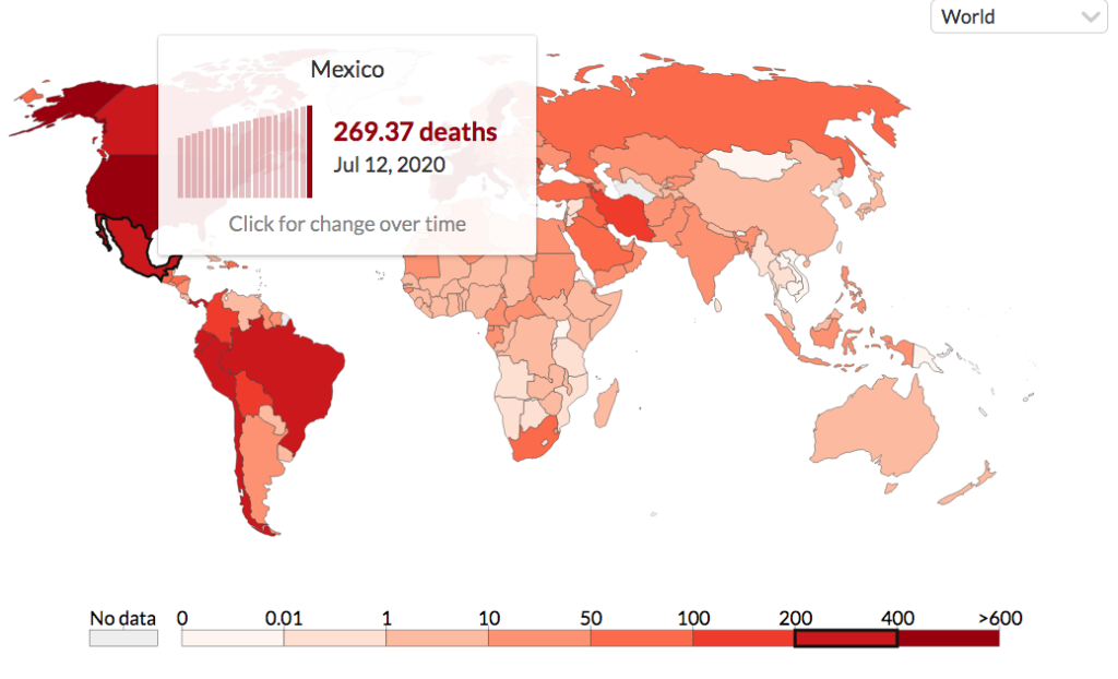 Según la tasa por cada millón de habitantes que publica diariamente el portal Nuestro Mundo en Datos, desarrollado por la Universidad de Oxford, México se encuentra en el lugar 19 a nivel internacional por número de fallecidos.