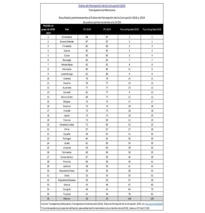 En el Índice de Percepción de la Corrupción 2019, México ocupa la posición 130 de 180 países evaluados, mejorando 8 posiciones respecto a 2018.