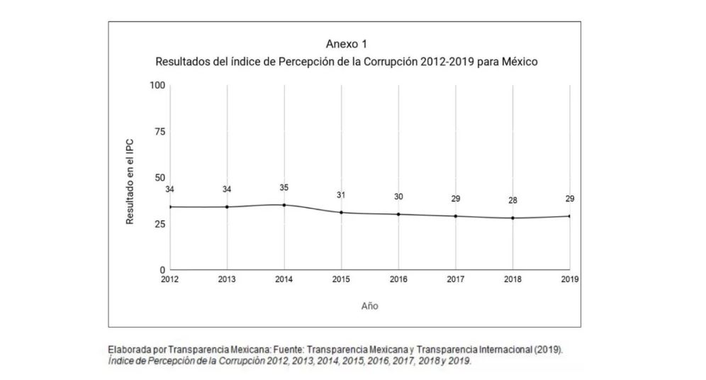 Al mejorar su calificación en un punto respecto a 2018, México detuvo una caída de 5 años consecutivos en el Índice de Percepción de la Corrupción de Transparencia Internacional. México obtuvo 29 de 100 puntos posibles en este instrumento internacional, lo que representa una diferencia de un punto respecto al 2018.