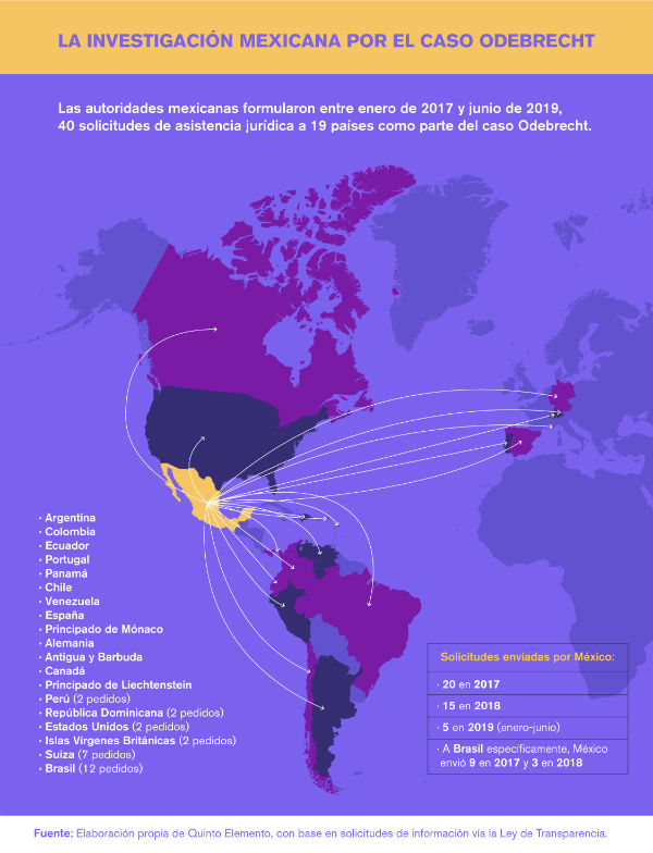 Esa docena de solicitudes, sin embargo, refleja que México ha sido uno de los países más inactivos en el envío de peticiones a Brasil. Desde que inició la investigación Lava Jato, los fiscales de Perú enviaron 174 pedidos, los de Suiza mandaron 121 solicitudes y las autoridades estadounidenses hicieron llegar 54 peticiones, de acuerdo con un informe de la secretaría de Cooperación Internacional brasileña al que tuvo acceso Quinto Elemento Lab.