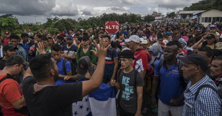 Allá, explica Héctor Santos, de 28 años, originario de Cortés, en Honduras, hay trabajo. “Nos han dicho que hay 4.000 puestos de trabajo allá”, dice. 4.000, los mismos que mencionó el presidente de México, Andrés Manuel López Obrador, el pasado viernes, en su habitual conferencia de prensa matutina. Santos es soltero, no tiene hijos, no avisó a nadie de que se iba con la caravana. No tiene teléfono, ni Facebook. Hoy calza unas chanclas azules sobre calcetines grises.