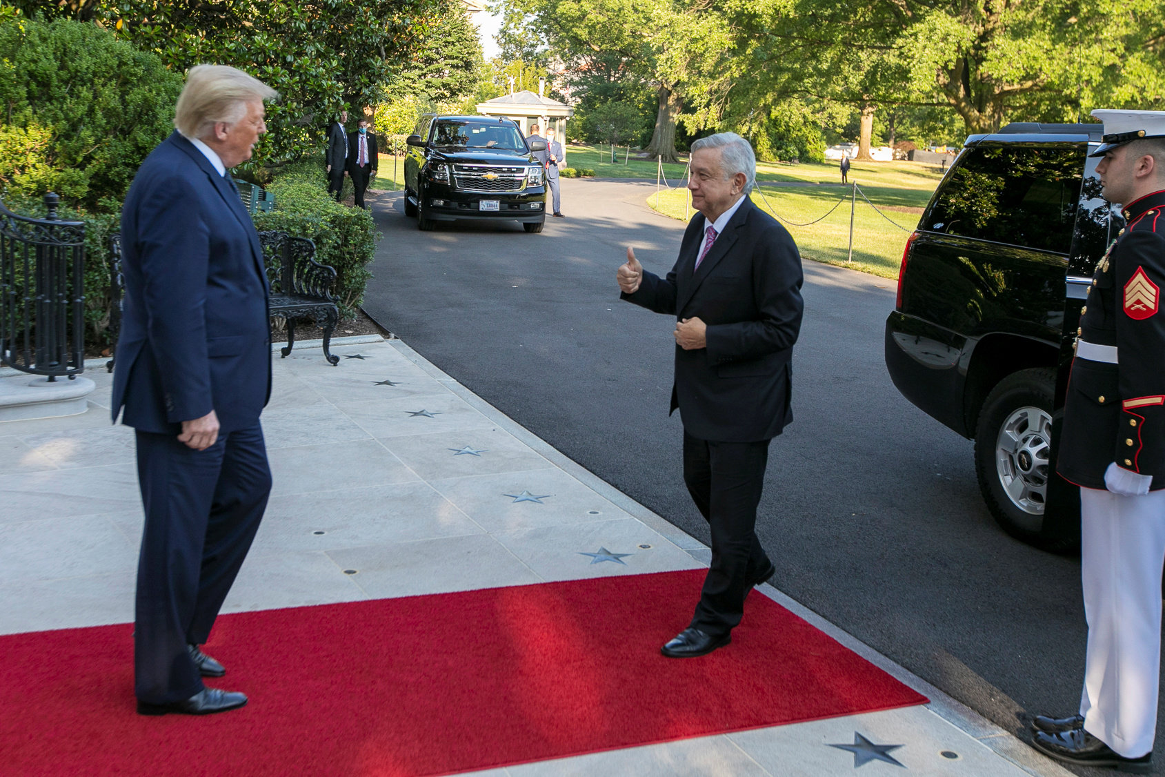 El cortocircuito que genera en México un presidente como Donald Trump, que ha vilipendiado desde hace años a los habitantes del vecino del sur, no ha evitado que Andrés Manuel López Obrador haya dirigido numerosos halagos a su homólogo tras la reunión que han mantenido este miércoles en la Casa Blanca. “En vez de distanciarnos hemos optado por viajar juntos, hacer a un lado las diferencias con diálogo y respeto mutuo. Hemos tenido desencuentros y hay agravios que todavía no se olvidan, pero también hemos podido establecer acuerdos tácitos y explícitos de cooperación”, ha recalcado López Obrador, para después elogiar a su homólogo estadounidense, el más antimexicano de la historia reciente. “En vez de agravios hemos recibido de usted comprensión y respeto”, ha dicho.“La relación de Estados Unidos y México nunca ha sido tan estrecha”. Con estas palabras Trump ha dado prácticamente la bienvenida al mexicano, a quien ha agradecido que su primera visita al extranjero en más de año y medio como presidente haya sido a Estados Unidos. La cumbre unió a dos líderes que habitan en distintas galaxias ideológicas y, aunque no lo pareciera este miércoles, mantienen intereses radicalmente opuestos en comercio e inmigración. Lo que sí comparten es un talante propenso a la polémica. El encuentro ha proporcionado a México un balón de oxígeno para el futuro de su economía, en medio del arranque del nuevo tratado comercial de Norteamérica, el T-MEC, sin importar el rédito electoral que vaya a sacar Trump de esta visita.La intervención posterior al encuentro, celebrada en el Jardín de las Rosas y en la que no se admitieron preguntas, estuvo repleta de halagos entre los mandatarios. Trump también subrayó las coincidencias con López Obrador. “Fue elegido para luchar contra la corrupción y para devolver el poder al pueblo… Ambos tenemos el interés de poner a nuestros países primero… Usted lo hizo, yo lo hice”, le dijo el republicano viéndole a la cara.López Obrador recurrió a la relación que mantuvieron el republicano Abraham Lincoln y Benito Juárez, al que continuamente se refiere como el mejor presidente de la historia de México, para hacer un paralelismo con la relación que viven ellos. “Algunos pensaban que nuestras diferencias ideológicas deberían llevarnos al enfrentamiento, afortunadamente ese mal augurio no se cumplió”, ha dicho López Obrador. “Fantástico”, repitió en un par de ocasiones Trump. Horas después, ambos mandatarios reincidieron en los cumplidos. “Somos amigos contra todo pronóstico”, dijo el estadounidense en otro breve mensaje conjunto. “En efecto, fallaron. No nos peleamos. Somos amigos y seguiremos siendo amigos”, complementó Obrador.Para el estadounidense, esta visita representa una fotografía del pulso ganado a México. Su amenaza arancelaria obligó a López Obrador a movilizar 25.000 elementos de la Guardia Nacional para frenar la inmigración centroamericana. Desde entonces ha caído un 85%. La cita también ha sido una buena oportunidad de desviar la atención de la pandemia, que el mismo día de la cumbre bilateral había llegado a los tres millones de contagios en Estados Unidos. Trump inició su campaña electoral a la presidencia hace cinco años poniendo a la inmigración mexicana en el punto de mira con declaraciones xenofóbicas.Ese discurso, sin embargo, se suavizó desde la llegada de López Obrador. Ambos comparten una actitud incrédula hacia los riesgos del coronavirus y crítica con los medios de comunicación. Ambos han hecho bandera de su rechazo a usar mascarillas y minimizado la amenaza de la crisis sanitaria. Martha Bárcena, la embajadora mexicana en Washington, explicaba a la prensa en los jardines de la Casa Blanca que podían no utilizar cubrebocas porque les habían hecho la prueba de la covid. Los presidentes no se estrecharon las manos al encontrarse en la puerta de la residencia oficial, aunque posaron juntos con el rostro descubierto y sin respetar la distancia de seguridad.Ambos mandatarios, pero especialmente López Obrador, celebraron el nuevo tratado comercial entre los dos países y Canadá, cuyo primer ministro, Justin Trudeau, rechazó acudir a la reunión. “El potencial futuro de Estados Unidos y México es ilimitado”, glosó Trump, quien al principio tuvo palabras de agradecimiento a los 36 millones de mexicoamericanos que viven en su país. “Son increíbles, gente trabajadora”, dijo, lejos de los ataques que, una y otra vez, ha desplegado contra los mexicanos y centroamericanos. Sobre migración, apenas hizo una referencia: “Estamos trabajando para combatir el narcotráfico y en crear nuevas leyes migratorias. Hemos tenido resultados significativos en la zona sur”.La comitiva empresarialUna muestra de la importancia que le ha dado México al aspecto económico se perfila en la comitiva. Al canciller, Marcelo Ebrard, que funge como si se tratase de un vicepresidente, le han acompañado la secretaria de Economía, Graciela Márquez y el jefe de la oficina de la presidencia, un empresario, Alfonso Romo. Pero la urgencia de reactivar la economía puede apreciarse por los empresarios mexicanos que han viajado a Washington: un grupo selecto de diez hombres y una mujer que acompañarán a los presidentes en la cena prevista para este miércoles.La mayoría de los hombres de negocios forman parte del Consejo Asesor Empresarial de López Obrador. Hay banqueros, arquitectos, un empresario de una fábrica de papel y un desarrollador turístico. También destacan altos ejecutivos de las empresas de comunicación, Televisa y Grupo Multimedios. La única mujer es Patricia Armendáriz, de 65 años, una financiera experta que colaboró en la negociación del primer tratado de libre comercio y hoy se especializa en las fintech desde Financiera Sustentable. “Son empresarios con dimensión social… están interesados en que le vaya bien al pueblo”, cali