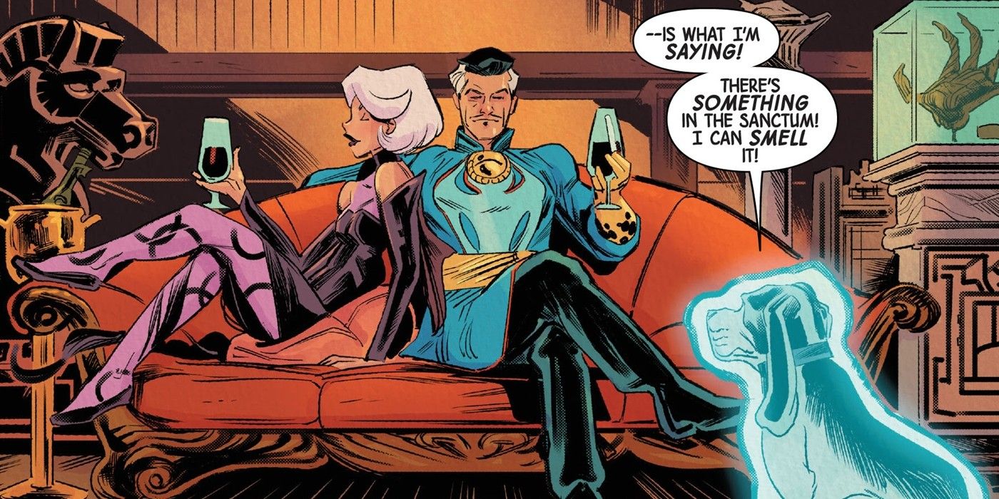doctor extraño El número 12 está escrito por Jed MacKay y dibujado por Danilo S. Beyruth. Bats, el perro fantasma de Strange, huele que algo anda mal en el Sanctum e intenta advertir a sus humanos. Strange ignora sus preocupaciones y dice que si alguien hubiera entrado al Sanctum, él lo sabría. Bats refuta esto señalando que Black Cat pudo hacerlo.