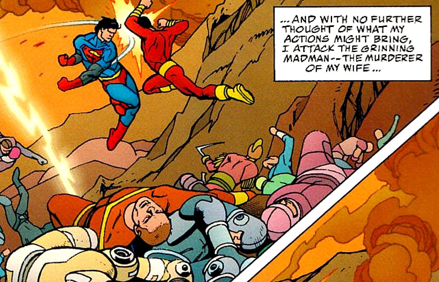 La pelea tiene lugar en 1998. Superman: fuegos distantes, de Howard Chaykin y Gil Kane. La historia se desarrolla en un futuro potencial donde el mundo ha sido diezmado por una guerra nuclear. Superman sobrevive e intenta hacer una nueva vida mientras está varado en el páramo irradiado de Metrópolis. Sin embargo, finalmente descubre una sociedad formada por otros héroes y los pocos humanos que sobrevivieron al desastre. Clark se casa con Wonder Woman y los dos tienen un hijo, pero con el paso de los años Shazam se vuelve cada vez más corrupto, culminando en una pelea que literalmente acaba con el mundo.