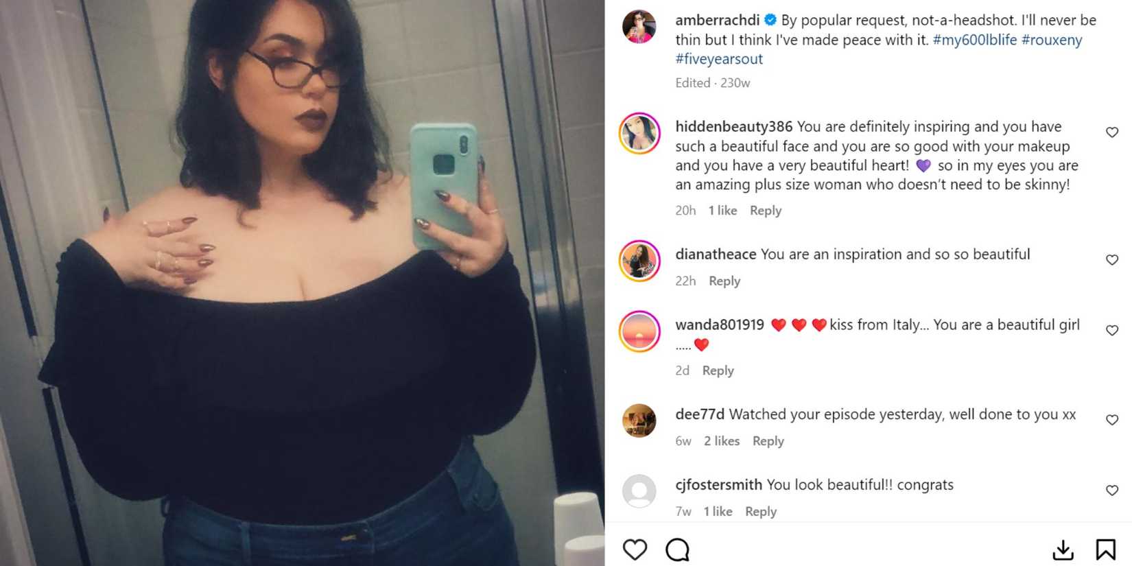 Amber recordó a los fans habían pasado 10 años desde que filmó Mi vida de 600 libras temporada 3. “Perdona mis ausencias, la mayoría de los días estoy demasiado cansado para siquiera pensar en ‘ser una figura pública’”. Amber también instó a sus seguidores, “Déjame descansar. Y además, como ser humano, puedo ganar y perder peso en paz”.