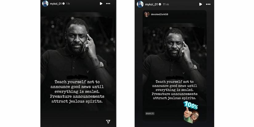 Compartió una historia de Instagram con el actor Idris Elba y una cita que decía: “Enséñese a no anunciar buenas noticias hasta que todo esté sellado.Michael también volvió a publicar una historia que un fan compartió con la misma cita y etiquetó al Prometido de 90 días protagonizarlo para darle crédito a Michael.