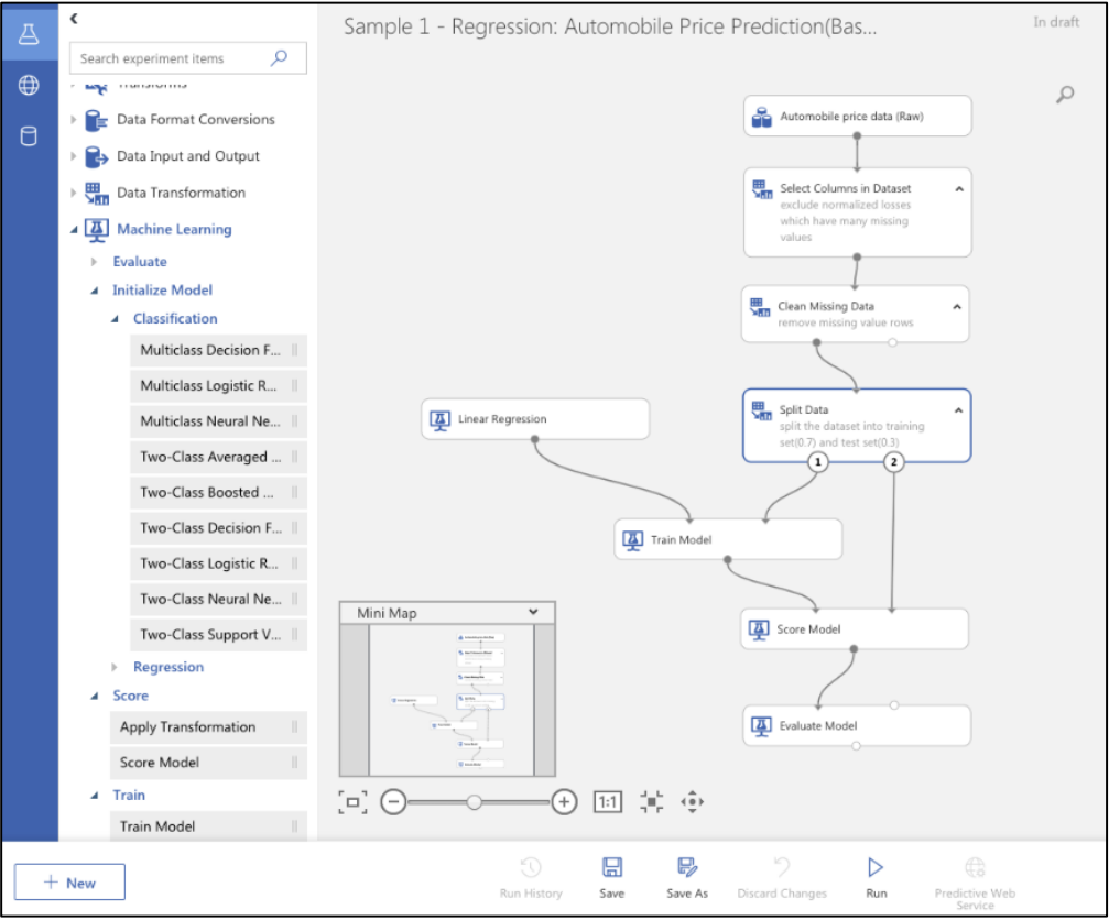Esta herramienta, la interfaz visual de Azure Machine Learning, se parece sospechosamente a la de Azure ML Studio, el primer intento de Microsoft de crear una herramienta de aprendizaje de máquina visual. De hecho, los dos servicios parecen idénticos. Sin embargo, la compañía realmente nunca impulsó este servicio, y casi parecía haberse olvidado de él a pesar del hecho de que siempre parecía una herramienta realmente útil para comenzar con el aprendizaje automático.