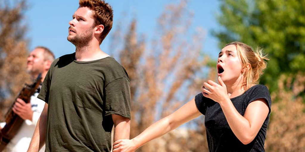 Dani ve el viaje como un escape, una oportunidad para recuperarse y salir de su cabeza ya que ha estado lidiando con el estrés postraumático después de su tragedia personal. También parece una salida potencial para volver a conectarse con su novio, ya que su relación se ha estancado y los dos están luchando por comunicarse. Esto prepara el escenario para las dificultades desde el principio, ya que los dos ya no se llevan bien y se encuentran en una comunidad extraña con tradiciones poco convencionales que se alimentan de su tensión ya palpable y sus nervios. Toda la historia pone a Dani y Christian en situaciones en las que se ven obligados a confiar el uno en el otro, y la confianza ya es escasa entre ellos, especialmente cuando una de las mujeres jóvenes en la comuna, Maja, le gusta y comienza a considerarlo como un potencial compañero.