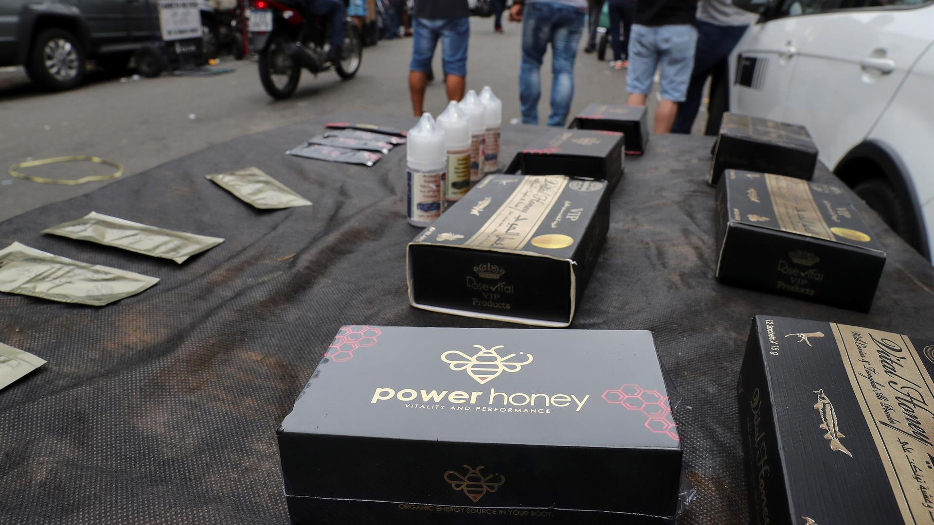 Sobre la mesa, una fila de sobres pequeños, parecidos a los de azúcar que sirven en las cafeterías, y varias cajas negras desgastadas por los lados en las que se pueden leer en letras doradas: “Power Honey” o “Vital Honey”. “Un sobre son entre 25 y 30 reales (4.5 y 5.5 dólares). La caja trae doce sobres y cuesta 150 reales (casi 30 dólares)”, explica el joven. Hay género específico para hombres, para mujeres y también unisex.