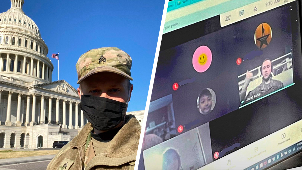 “Así es como luce un héroe. [Como] miembro de la Guardia Nacional de D.C., nuestro maestro de banda Dr. Jake Kohut ha estado trabajando día y noche desde el miércoles para proteger a la capital de nuestra nación. Y entre sus turnos, está dedicado a los estudiantes de CWES, enseñando desde D.C.”