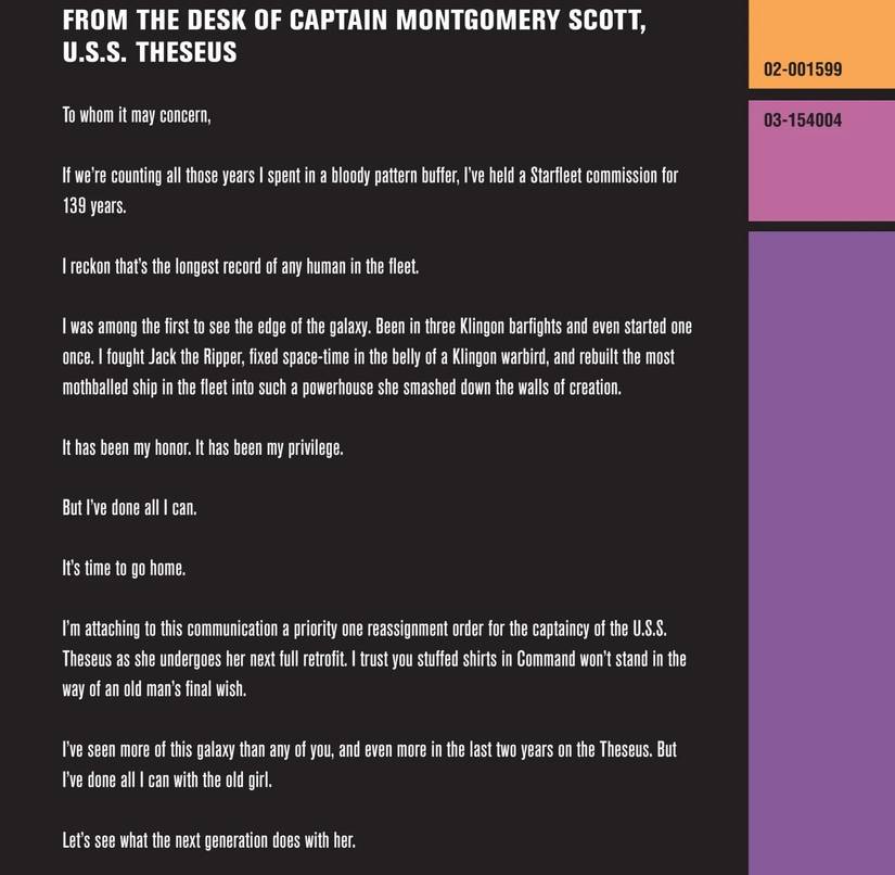 Las últimas palabras de Scotty vienen en forma de su renuncia oficial de Starfleet …