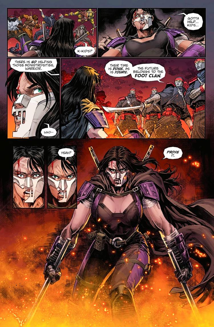 Tortugas Ninja Mutant Mutant: The Last Ronin II-Reevolución #5, coescrito por Kevin Eastman y Tom Waltz, con arte de Ben Bishop, termina con una nota trágica. Con sus últimas palabras, abril pasó el manto del protector y maestro de las tortugas ninja a su hijaquien hasta este punto ha llenado el vacío dejado por la muerte de su padre, el Casey Jones original.