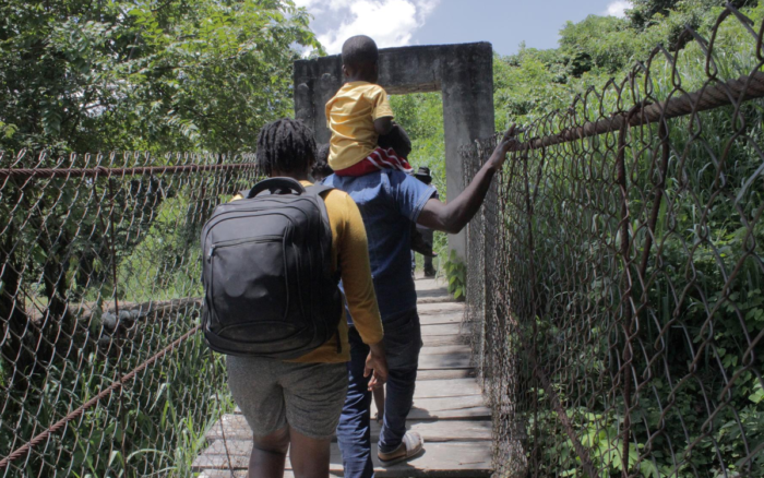 Los extranjeros cruzan un puente de hamaca para poder internarse a la comunidad de San Nicolás Lagartero para luego tomar colectivos o taxis que los llevarán al municipio e iniciar así de manera inmediata su proceso de asilo en la Comisión Mexicana de Ayuda a Refugiados (COMAR).