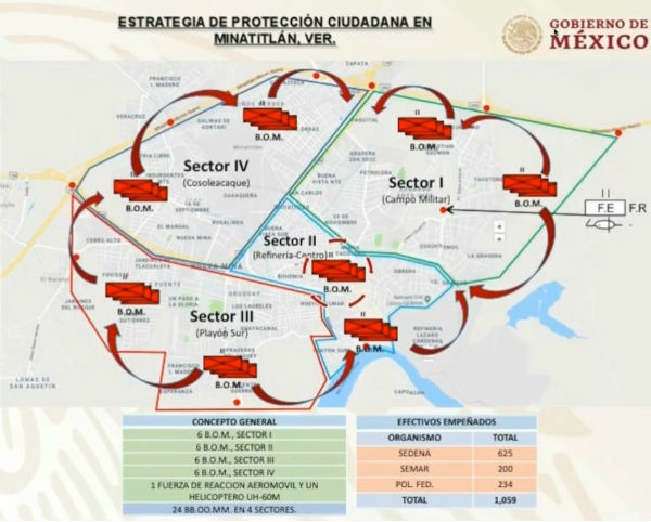 El coronel Albarrán Mendoza tendrá bajo su mando a un total de mil 59 elementos para atender las ciudades de Minatitlán y Cosoleacaque: 625 policías militares, 200 policías navales y 234 policías federales.