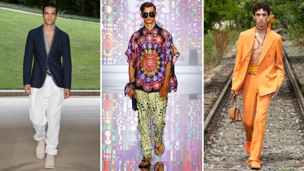 En Etro, la inspiración es el espíritu nómada de esta casa experta en transformar motivos tradicionales de todo el mundo en sofisticados estampados de lujo. Durante el desfile, celebrado en unas antiguas vías de tren reconquistadas por la maleza, no dejó de sonar L’Era del Cinghiale Bianco de Franco Battiato, fallecido el pasado mayo y amigo personal de Kean Etro, el director creativo. Sin embargo, nada más lejos de lo elegíaco. Los inconfundibles motivos florales de la casa adquieren tonos intensos y ácidos, se disponen sobre fondos degradados y coquetean con detalles brillantes y metalizados que recuerdan que fue Etro la firma que vistió a la banda Maneskin durante la actuación que les dio la victoria de Eurovisión el pasado mes. La colección, una oda a los materiales ligeros, la seda e incluso la gasa, apuntala la transformación del armario masculino.