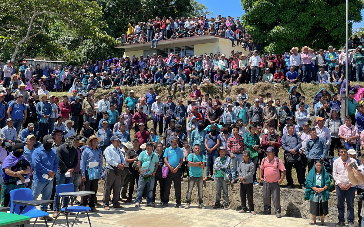 A San José Buenavista Tercero llegaron desde las primeras horas de este domingo 18 de julio. Mujeres con sus trajes tradicionales de las etnias tseltal y tsotsil, hombres de manos callosas y piel curtida por el trabajo en el campo, se fueron colocando alrededor de la cancha de basquetbol que ocupa el centro del poblado. Sumaron más de 3 mil 500 personas provenientes de las 86 comunidades de Pantelhó.