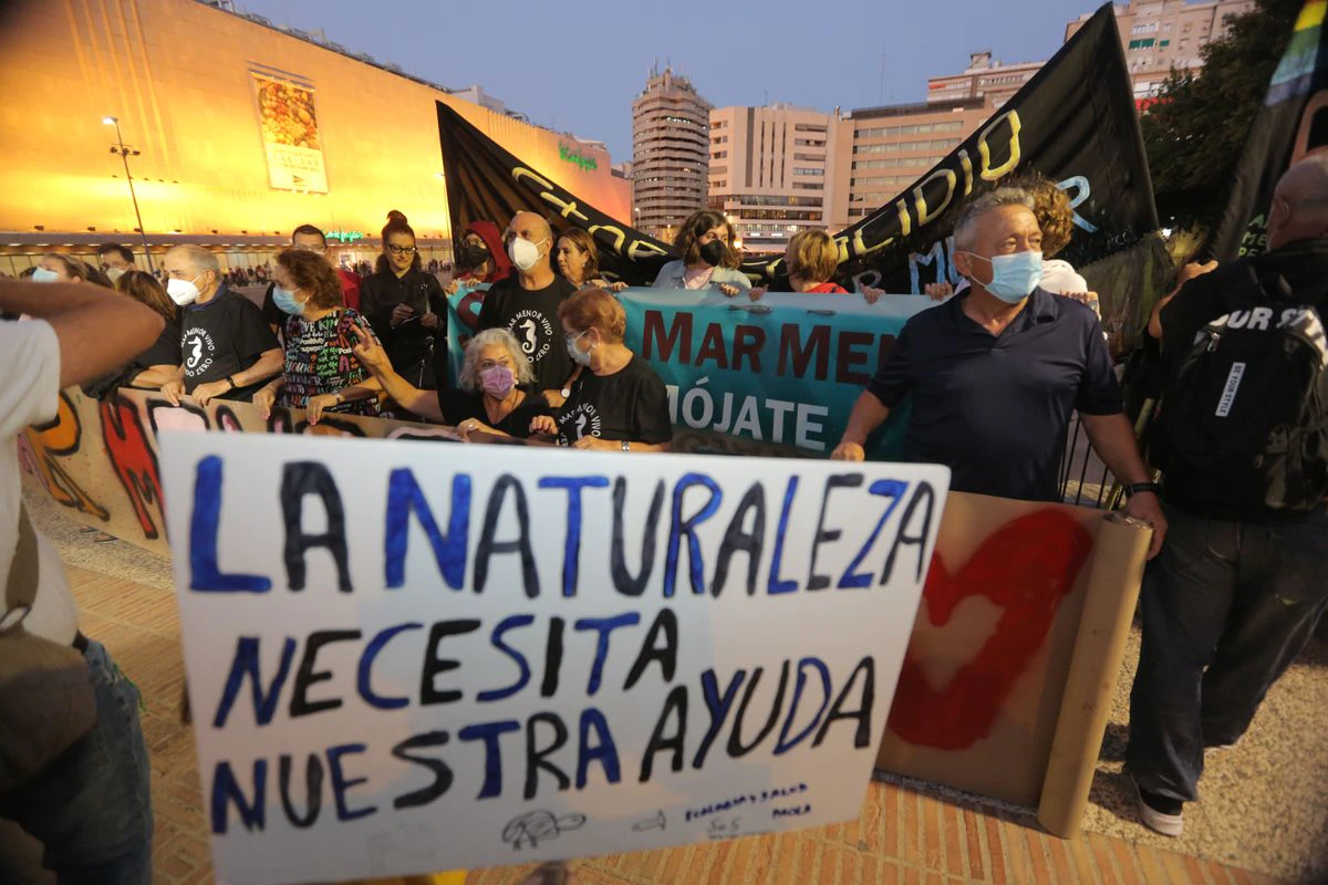 Ese “grito de socorro”, ha recordado el presidente de Asociación de Naturalistas del Sureste, Pedro García, ya se oyó hace dos años en Cartagena, cuando toneladas de peces emergieron muertos en las playas bañadas por el mar Menor por la falta de oxígeno de sus aguas. Entonces unas 55.000 personas salieron a la calle. A la cita de este jueves han acudido unas 45.000, según los cálculos de los organizadores, pero el “grito” social, asegura García, es el mismo después del otro episodio de anoxia de agosto. En ambas ocasiones, la Administración regional culpó de ello a factores externos: las lluvias torrenciales en 2019 o el aumento de la temperatura en 2021. “No han parado de mentirnos sobre la salud del mar Menor y nos han mentido sobre el origen de su estado crítico”, decía el manifiesto que se ha leído ante la Consejería de Agricultura, Agua y Medio Ambiente.