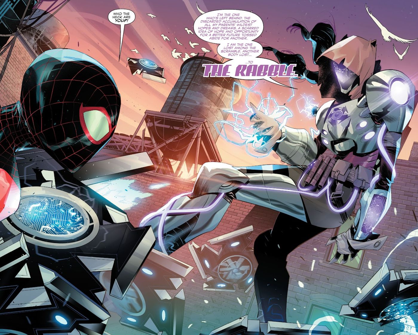 #18, el joven Webslinger se enfrenta a su archienemigo Rabble, quien está decidido a hacerle perder todo lo que le importa. - Rabble, un enemigo con un rencor profundamente personal contra Miles, tiene la capacidad de comunicarse con las máquinas y ha utilizado todas sus habilidades para lastimar a Miles.