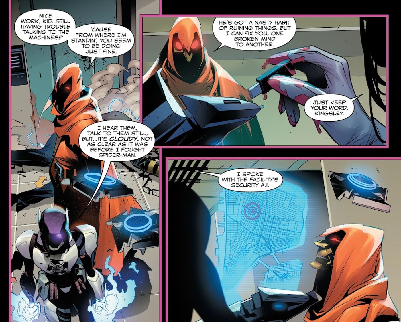 Desde pequeño, Rabble pudo comunicarse con las máquinas. Su padre llevaba a su hija pequeña a la comunión con una caja registradora que no cooperaba; su madre le dijo que tenía más afinidad por los circuitos que por las personas. Ha volcado todos sus dones en venganza, amenazando a los amigos y familiares de Miles en el camino. Los dos tuvieron un enfrentamiento importante en Miles Morales: Spider-Man # 5, que dejó a Rabble fuera de servicio y sus poderes estropeados. Esto le ha dado aún más motivos para odiar a Miles. A Raneem sólo le queda rabia, y Miles Morales: Spider-Man El número 18 lo promete en pantalla completa.