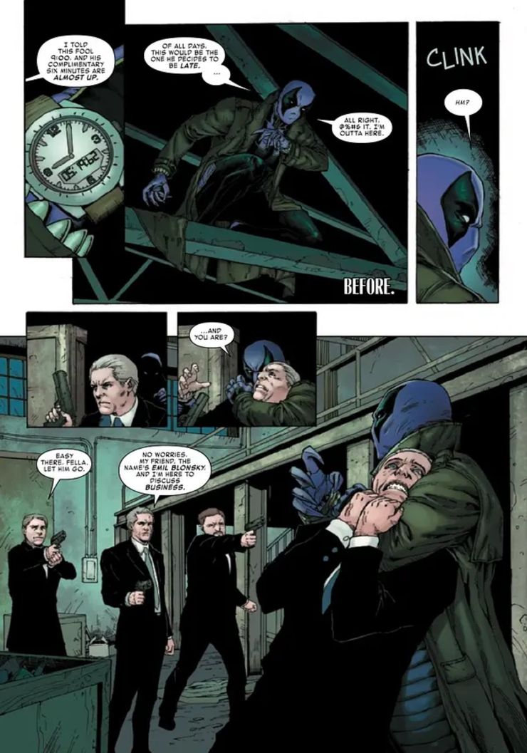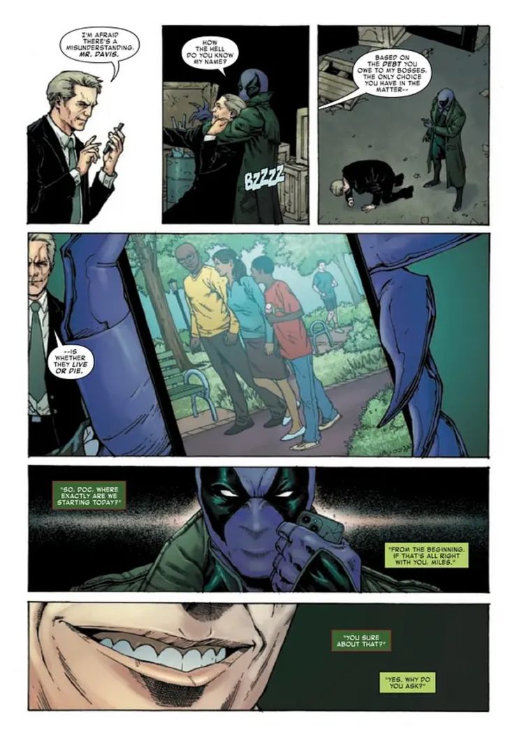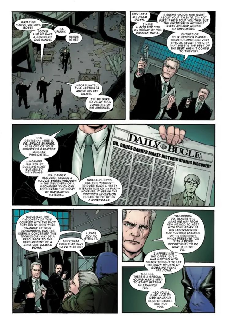 En una nueva vista previa (AIPT) para Y si… Miles Morales #3 por Anthony Piper, Edgar Salazar, Chris Sotomayor, Cory Petit de VC y Paco Media de Marvel Comics, el tío Aaron de Miles Morales conoce a Emil Blonsky. Le informa a Prowler que su jefe Viktor quiere que robe el último avance del Dr. Bruce Banner, un mecanismo alimentado por rayos gamma que puede acelerar la descomposición del material radiactivo. Al Kremlin le preocupa que el descubrimiento de Banner trabajando con los EE. UU. sea un precursor de la creación de una bomba impulsada por Gamma. Prowler se niega, diciendo que quiere dar ejemplo a un “joven especial”, pero Bolonsky lo amenaza. Mientras tanto, se le dice al origen de Morales Hulk, como le dice a un médico, que “no está seguro de si le gustaría cuando estoy enojado”.