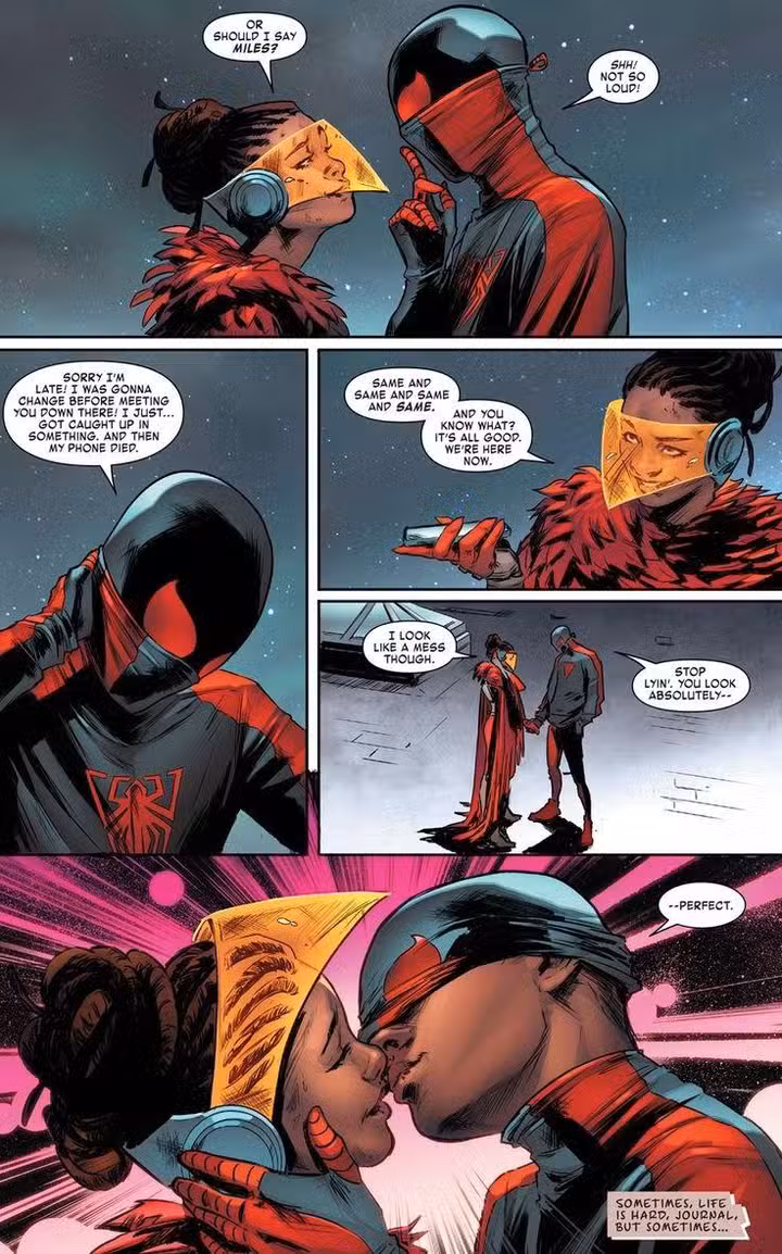 Y, como Spider-Man, la juventud de Miles les da a los creativos el espacio para las piernas con el cual pueden tenerle al personaje un montón de intereses amorosos y probar esas aguas. Es probable que Miles aún no haya conocido a su ‘Mary Jane’, por ejemplo, y no atarlo a ninguna chica permite una mayor diversidad en términos de los personajes que podría conocer en el futuro.