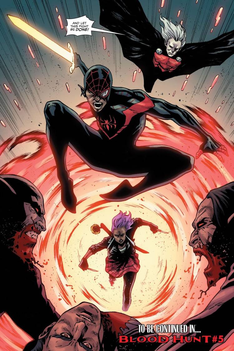 En Miles Morales: El Hombre Araña #22, el héroe, que se ha convertido en vampiro, mordido por Blade, lucha por combatir esta amenaza, incluso con la ayuda de un velocista tan rápido como Hightail, pero la llegada de Bloodline ayuda a nivelar el campo de juego. Desde que el dúo se reunió durante esta historia, Marvel’s El evento “Blood Hunt” ha demostrado la fuerte química entre Miles y Blood, tanto dentro como fuera del campo de batalla. Claramente se llevan bien y son capaces de formular un plan de juego eficiente para eliminar varios vampiros a la vez en un tiempo récord.