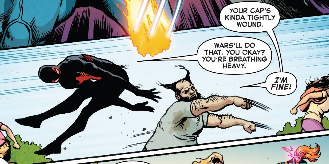 Eliminando el diseño palmeado de su último disfraz, Miles allana el camino para una apariencia que recuerda al traje negro de simbionte de Peter Parker, aunque no está claro si el nuevo atuendo de Miles tiene habilidades especiales, como el de Peter, o si es solo un uniforme normal que, si bien no es increíblemente diferente de su apariencia habitual, aún se siente apropiadamente oficial y parecido a Spider-Man en su simplicidad. Rebotando por el campo de batalla mientras se balancea y zigzaguea alrededor de los Wolverines, se ve a Miles más adelante en el número levantándose la máscara, lo que confirma que este traje no es de alta tecnología ni siquiera creado por un simbionte por naturaleza.