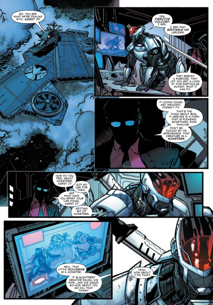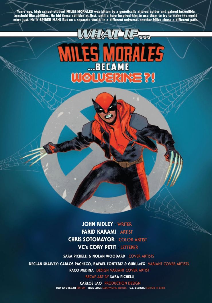La vista previa se centra en los agentes de SHIELD que cazan a Wolverine, ya que el director Colcord lo llama monstruo y no es tan joven e inocente como parece. Envía al Agente J tras él mientras se pregunta cómo se supone que debe matar a Morales. Se revela que Wolverine es culpado por el brutal asesinato de toda la familia del Senador Walsh. Más tarde se ve al Agente J acercándose a Miles Morales mientras le dice que se dé la vuelta, diciendo que no le importa si parece un niño. Wolverine responde desenvainando sus garras e informándole que no es un niño.