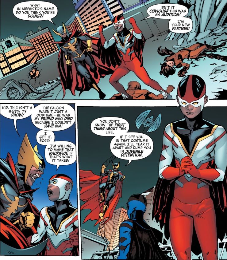 Esto lleva a los adolescentes a cambiar el nombre de su equipo como Campeones, queriendo ser mejores como la próxima generación de héroes. Sin embargo, se reveló que Nighthawk todavía estaba buscando a Miles como el nuevo Halcón. A pesar de sus afirmaciones de que quería “ayudar” a Miles, tanto Girl Power como Kid Spectrum fueron lo suficientemente inteligentes como para darse cuenta de que Nighthawk estaba mintiendo, y cubrieron a su nuevo amigo. Si bien parece que la relación con la versión de Batman de Marvel no se transfirió, todavía es genial verlo. Miles Morales como el nuevo Falcon y Robin contraparte no obstante en Héroes renacidos.