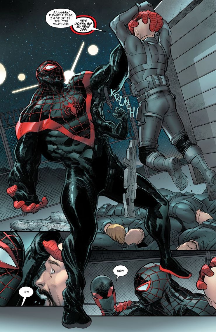 Después de ser visitado por Beyond Corporation (que amenaza con demandar a Miles por el uso del nombre de Spider-Man), Miles se une a Ben Reilly, patrocinado por Beyond, para acabar con un supervillano. Miles cree que el Asesor está detrás de la tecnología del nuevo enemigo, por lo que se une a Shift y rastrea la corporación del Asesor hasta un gran complejo. Docenas de guardias son alertados de su presencia, y Miles y Shift luchan contra ellos fácilmente … pero Shift es considerablemente más violento. “¡No le arrancamos la cabeza a la gente! ¿Me oyes?” grita Miles mientras Shift mantiene a uno de los guardias a su merced.