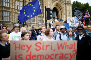 Los manifestantes con pancartas acusaron a Johnson de organizar un golpe político. Quienes se oponen a Johnson afirman que su decisión, aprobada por la reina, es una medida encaminada deliberadamente a restringir la capacidad de los parlamentarios para impedir una salida de Reino Unido de la Unión Europea sin acuerdo el 31 de octubre.