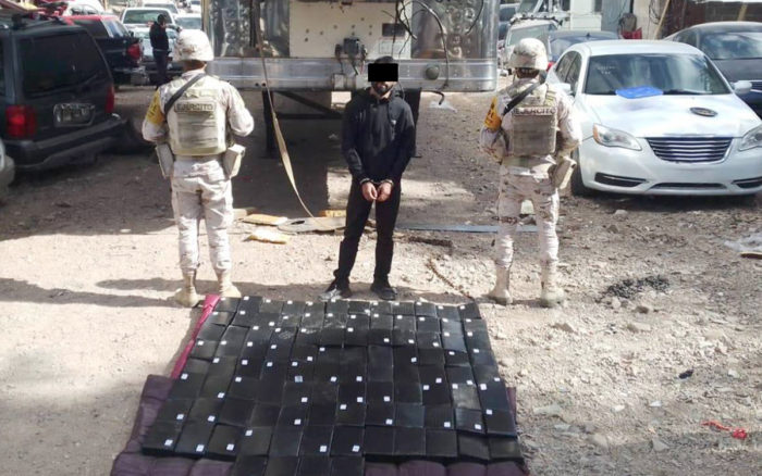 Elementos de la Guardia Nacional y del Ejército aseguraron 100 paquetes que eran transportados en un camión en las inmediaciones del kilómetro 242+000 de la carretera Hermosillo-Nogales, en el municipio de Ímuris, Sonora.