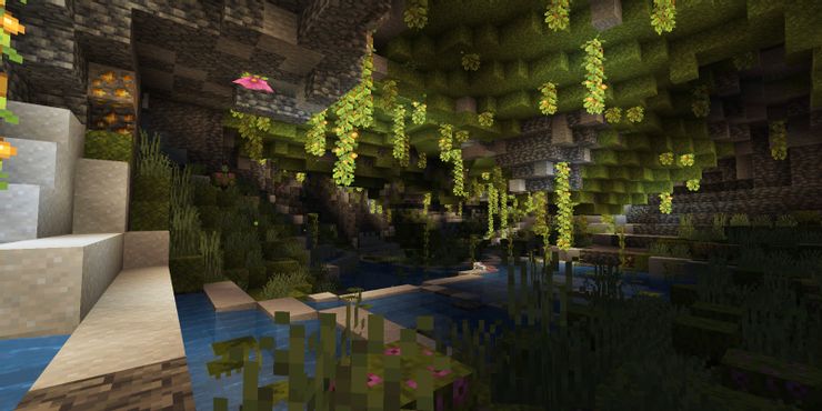 Las exuberantes cuevas son posiblemente las más singulares de las nuevas Minecraft biomas, que contienen una multitud de nuevos elementos introducidos en Minecraft‘s Cuevas y acantilados, parte 1 actualizar. Plantas de azalea, raíces colgantes, dripleaf, bayas luminosas y flores de esporas son solo algunas de las nuevas plantas que se pueden encontrar en este bioma, y mobs únicos como los calamares luminosos y el ajolote también aparecen con frecuencia en los lagos y estanques de exuberantes cuevas. . Las alfombras de musgo se generan a lo largo del suelo, y en ocasiones pueden aparecer en estas cuevas estructuras como geodas de amatista y pozos de minas. Aunque pueden ser un poco más difíciles de descubrir, los jugadores pueden buscar árboles de azalea en la superficie como una indicación de que podría haber un sistema de cuevas cerca. Vale la pena buscarlos junto con todos los demás biomas introducidos en Minecraft Cuevas y acantilados, parte 2, sirviendo como una sorpresa de bienvenida incluso para los más experimentados Minecraft jugadores.
