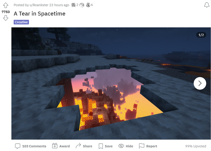 Compartido en Reddit por el usuario Roankster, esta creación utiliza el mod Immersive Portals para crear una grieta en el Minecraft realidad que permite a los jugadores viajar directamente a través de las dimensiones al Nether sin el uso de un portal Nether. Las capturas de pantalla muestran la perspectiva del jugador tanto desde el supramundo como desde Nether, lo que le permite al jugador ver directamente otra dimensión. Dado que los portales Nether generalmente no permiten que el jugador vea lo que está al otro lado, la perspectiva de ver realmente el Nether es hermosa y desconcertante.