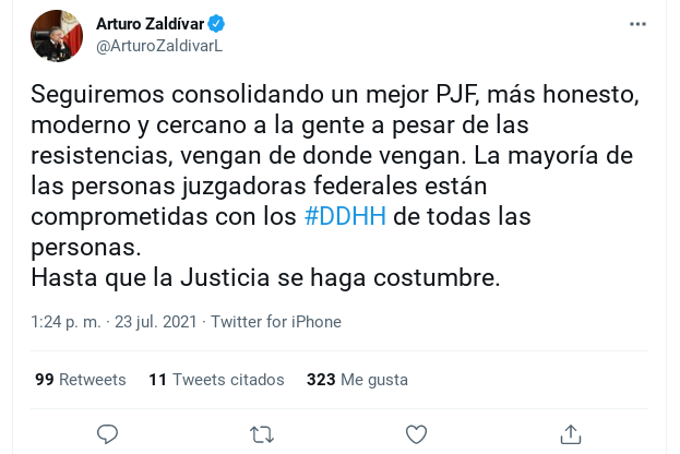 A través de su cuenta de Twitter, Zaldívar afirmó que el Poder Judicial será “más honesto, moderno y cercano a la gente”, esto, “a pesar de las resistencias, vengan de donde vengan”.