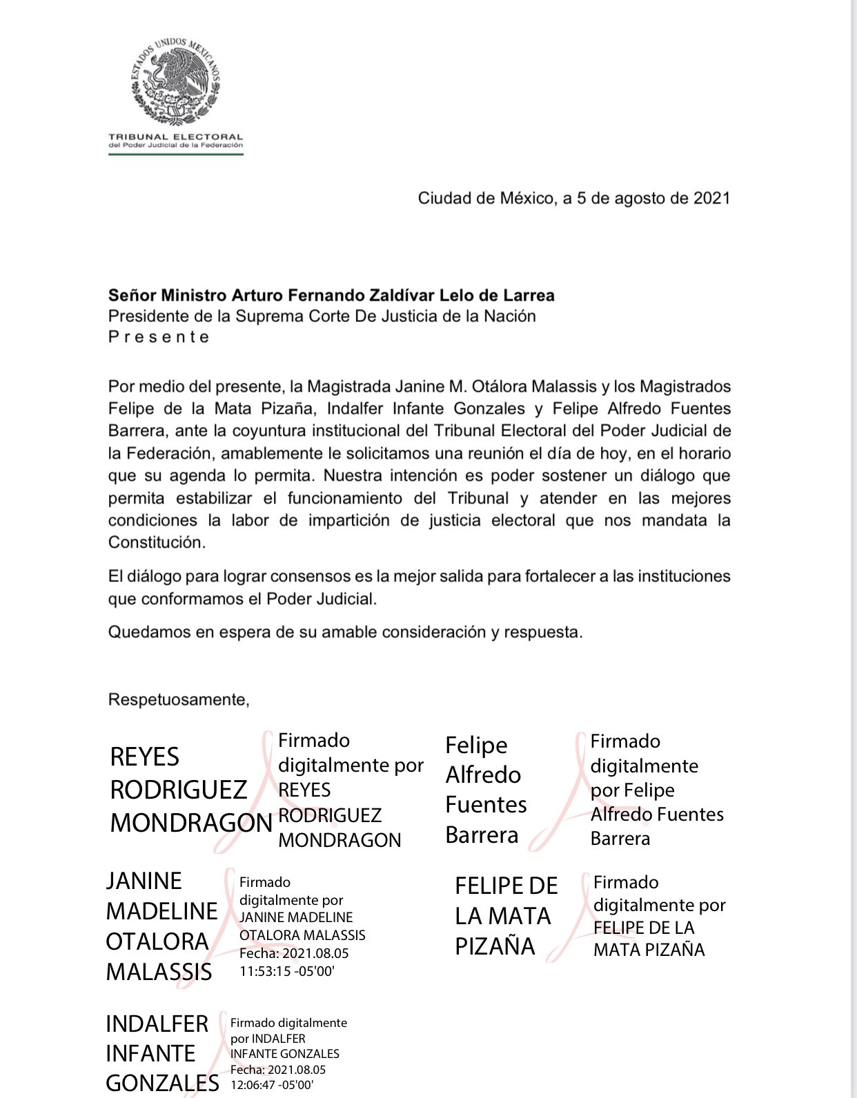 La reunión fue solicitada por los magistrados a través de una carta con fecha 5 de agosto, en la que expresaban que su intención era “estabilizar el funcionamiento del Tribunal y atender en las mejores condiciones la labor de impartición de justicia electoral que nos mandata la Constitución. El diálogo para lograr consensos es la mejor salida para fortalecer a las instituciones que conformamos el Poder Judicial”.