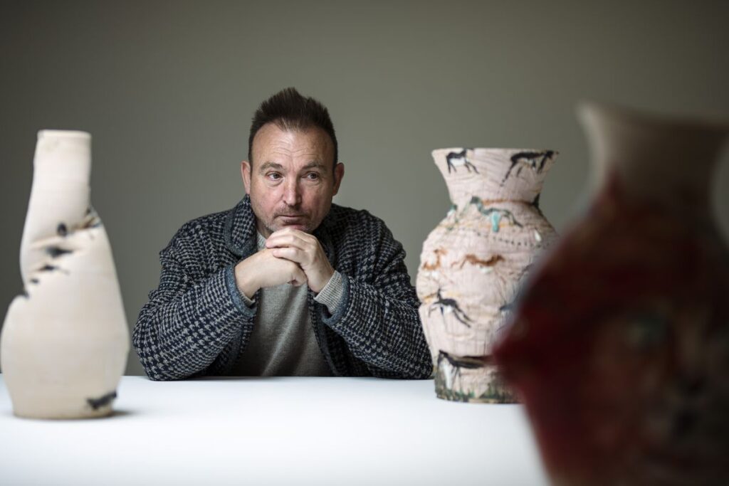 La luz blanca de la sala se rompe con el estallido de intensos fucsias, amarillos, rojos, verdes y azules de las pinturas que expone Miquel Barceló en la Galería Elvira González (Madrid, hasta el 28 de mayo), junto a cerámicas caprichosas, jarras, barros que ocupan una de las mesas: son “restos del naufragio”, dice, de un proceso de cocción y moldeado que a veces decide por su cuenta el resultado o el fracaso final. Posa para la fotógrafa, pero enseguida sale corriendo, Barceló siempre corre, y esta vez también, antes de sentarnos en el despacho de la galería para hablar de libros, de su escritura, de otros vicios compulsivos.